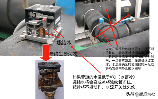 冰蓄冷的乙二醇溶液的温度可能低达-10℃,波纹管与大气接触,与微动开关接触的也是金属件,水流开关非插入乙二醇溶液的外部的金属部件可能低于0℃。