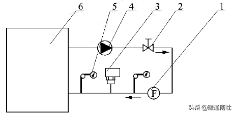 1.流量计;2.流量调节阀;3.水流开关;4.水泵;5.压力表;6.水箱。