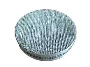 波纹填料是由许多层波纹薄片组成,各片高度相同但长短不等,搭配组合成圆盘状,填料波纹与水平方向成45°倾角,相邻两片反向重叠使其波纹互相垂直。圆盘填料块水平放入塔内,相邻两圆盘的波纹薄片方向互成90°角。