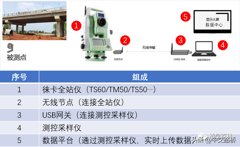 本产品为匹配徕卡全型号系列测量机器人的无线传输设备和数据监测软件。采用徕卡测量机器人对桥梁荷载试验或转体施工过程中的观测点进行实时观测,数据通过无线传输设备实时传送到笔记本电脑或指挥中心大屏。