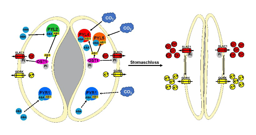 植物叶片气孔的开/关是通过成对的包围每个气孔的特殊保卫细胞来完成的。保卫细胞必须能够测量光合作用和水的供应,以适应不断变化的环境条件。为了达到这个目的,保卫细胞中存在可以测量叶子内部CO2浓度的受体。当叶子内部的CO2值急剧上升时(光合作用不理想的信号),保卫细胞就会关闭气孔,防止不必要的蒸发。一旦CO2浓度下降,气孔就会重新打开。