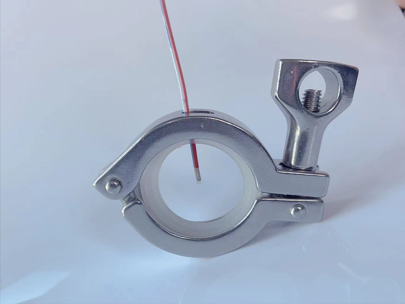 晏玛科技SIP管道验证卡箍采用304/316L不锈钢精密铸造卫生级重型卡箍。为了保证探头不被挤压,使用了带有加厚开孔的硅胶垫圈。卡箍的卡槽宽度比普通标准卡箍大。开口卡箍适用于高纯度制药系统的无菌验证,可轻松打开卡箍安装在两个标准的卫生级法兰之间来锁定法兰。卡箍上有一个切口可以安装热电偶或其他附件。