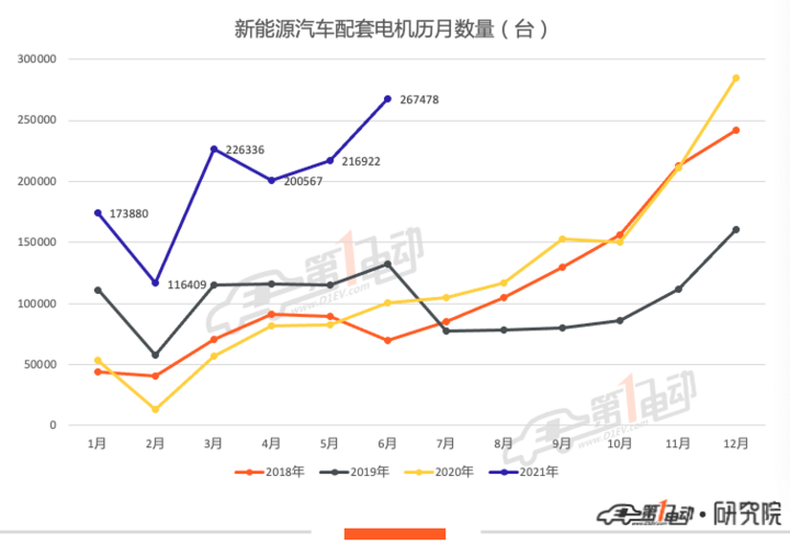 根据第一电动研究院统计,2021年6月新能源汽车配套驱动电机装机数量达267,478台,环比上升23.2%,同比增长166.5%。