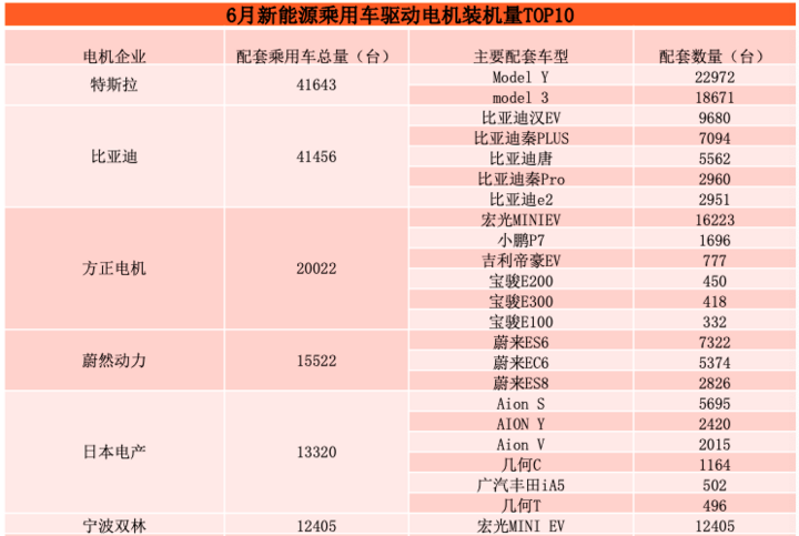 特斯拉和比亚迪“双雄争霸”角逐赛开启。6月,比亚迪新能源汽车电机装机量42,148台,以505台的优势再次超越特斯拉夺冠。方正电机、蔚然动力、日本电产分列前五。