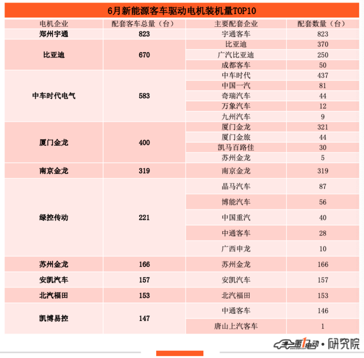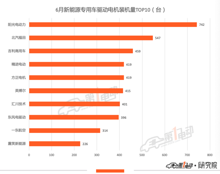 吉利商用车配套量为459台,上升二位至第三,主要配套企业为吉利商用车和唐骏欧铃。一东航空配套量314台,从5月第三下降至6月第九。汇川技术配套量为401台,从5月第一,下降至6月第七。