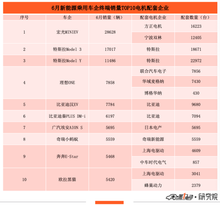 我们再看看6月销量TOP10新能源车型搭载的电机均来自于哪些企业?