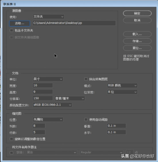 2.此时会弹出一个对话框,选取照片的路径,若有子文件夹,需要将其进行勾选,再进行其它数值的设置。这里单位为英寸16:9,分辨率为150,位置横向,列宽数根据实际照片数量,垂直水平间距0.1in,其他可进行的勾选的选项,可以根据实际需要勾选