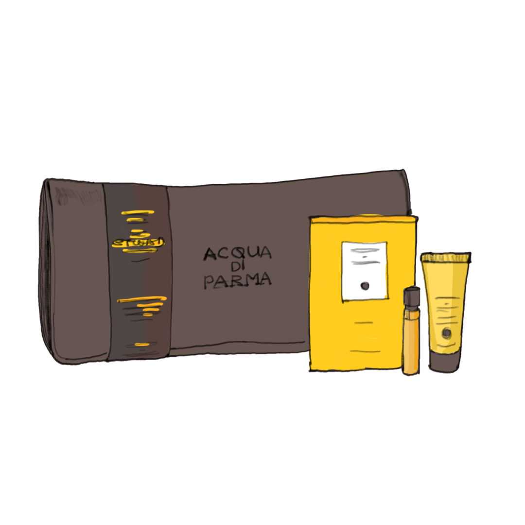 阿提哈德航空:商务舱的洗漱用品由意大利香水品牌帕尔玛之水(ACQUADIPARMA)提供,男女通用钱包式洗漱包有黄色及黑色配色,扣上按扣后,可变为收纳盒,包内含有Colonia小样香水和护手霜。