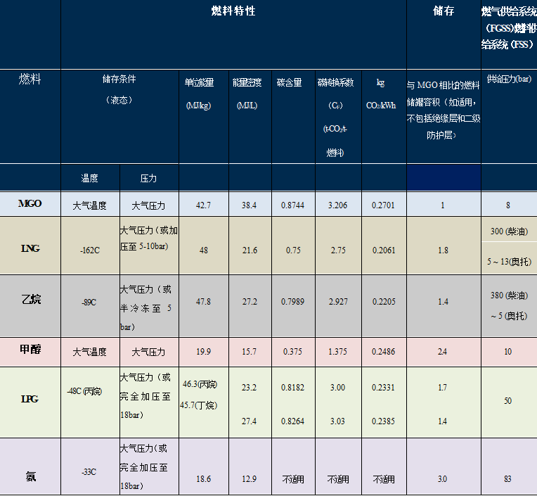 表10替代燃料的关键特性、所需储存容量和供给条件