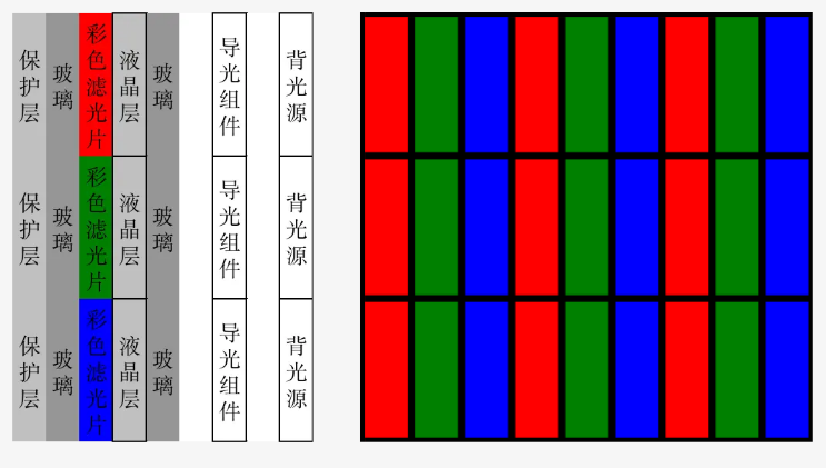 4、背光源发出的亮光经过导光组件,形成均匀的白色光源,照射液晶层,液晶层加电则会根据电流强度变化透明度,穿透液晶层的光线经过滤光片和玻璃后展现在人眼中是明暗不一的彩色像素点(分辨率的即是该液晶屏的像素点阵列数量)N个像素阵列组合成一幅色彩鲜艳的画面;