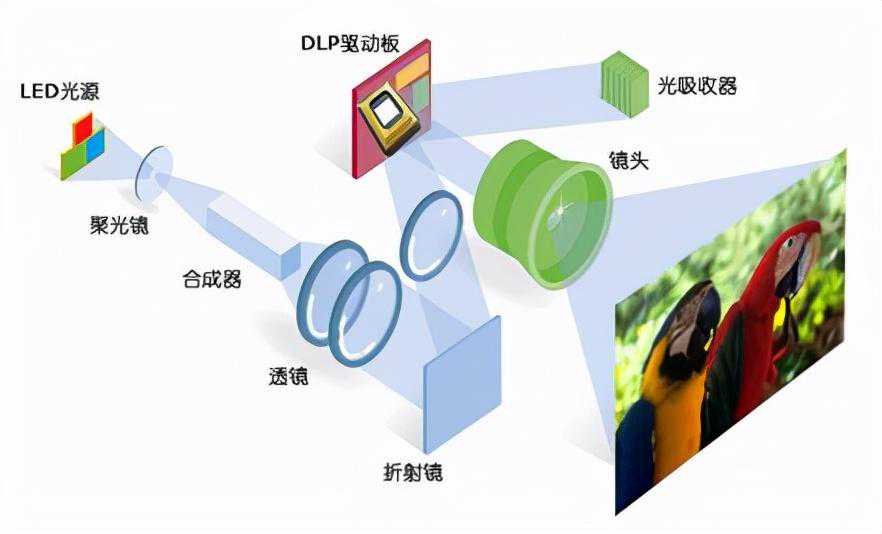 4、DLP由光源经过光学器件的聚焦,分色,折射到DMD芯片,DMD芯片有几十上百万个受驱动电路控制的微镜,变换着光线,变化后的光线经镜头放大,投射到屏幕上,形成彩色图像;