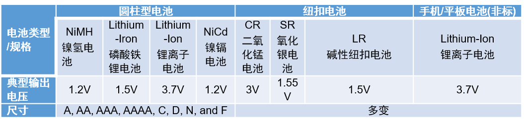 图片1展示了常见的一些电池类型,包括圆柱型电池,纽扣电池和手机/平板电池(非标)。
