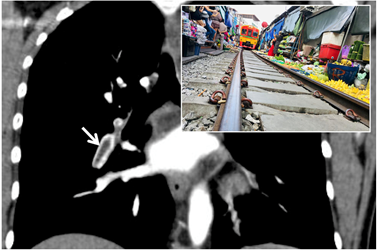 此外,在胸部影像学表现中,除了支气管相关双轨征,在胸部并驾齐驱的平行轨道还见于急性肺栓塞导致的肺动脉双轨征。