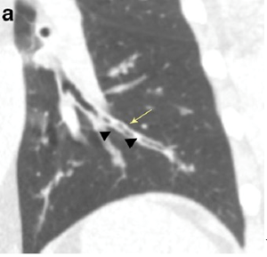 支气管炎引起的支气管壁增厚形成的双轨征(黄箭头),支气管内的粘液栓(黑箭头)[6]