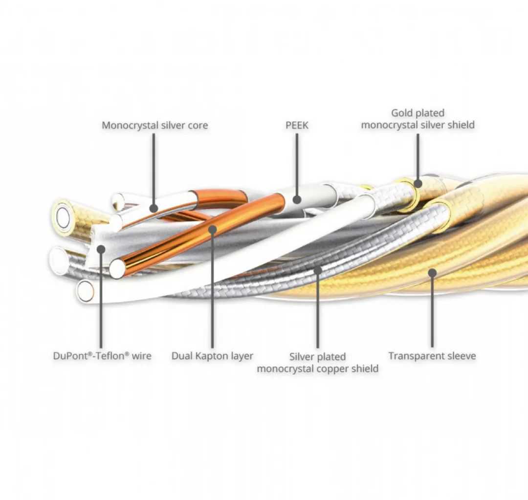 第一,TheUltimateDream的线材布局形成了一个信号传输无损无误的柔软结构,其内由全单晶银工艺制成的6根纯单晶线除能大幅提升单晶体的性能外,更主要的是,它使声音的整体特性得到提高,给人更逼真、更干净,细节更清晰,层次也更分明的听感。而中心银金芯线的优点则是,因非常低的接地阻抗而使任何接地回路的噪声被完全消除。