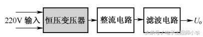 从图中可以看出,它由恒压变压器、整流电路和滤波电路3个部分构成。220V交流市电直接送入恒压变压器中进行降压和稳定交流输出电压,稳定后的交流低电压送入整流电路中进行整流,然后送到滤波电路中得到输出电压稳定的直流工作电压。
