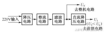 从方框图中可以看出,从电源电路输出的直流工作电压Uo最高,经直流降压电路后获得电压等级更低的直流工作电压U1。这样的直流降压电路可以一节节串联下去,便能得到更多的大小不同的直流工作电压。