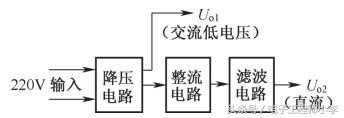 从这一方框图中可以看出,降压电路的输出有两路:一路加到整流、滤波电路,得到直流工作电压Uo2;另一路直接输出一个交流低电压Uo1,加到整机电路需要交流低电压的电路中。