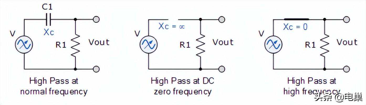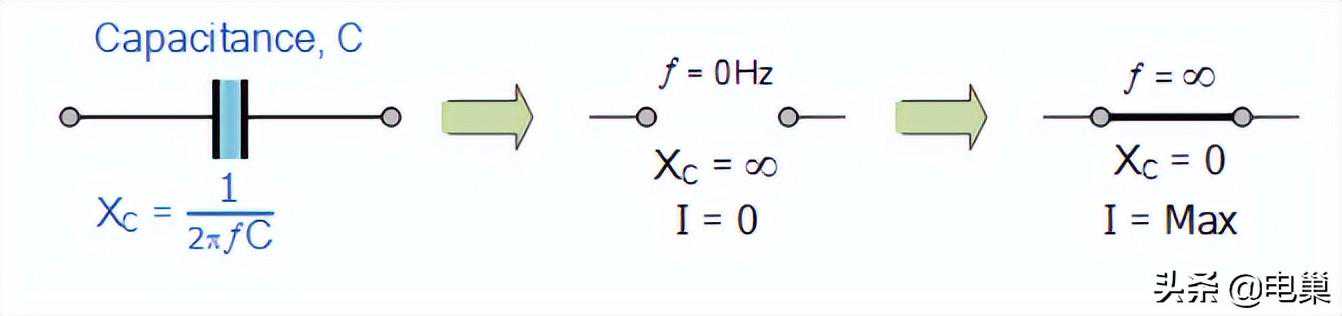 电容电抗总结因此,我们可以将变频电路中电容器的行为概括为一种频率控制电阻器,该电阻器在极低频率下具有高容抗电阻值(开路条件),在非常高的频率下具有低容性电抗值(短路条件),如上图所示。