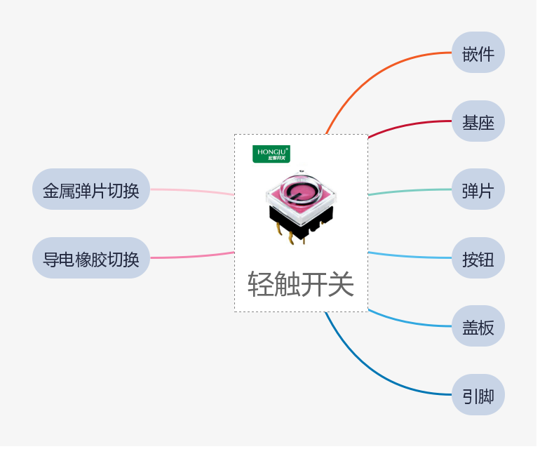 使用者只有在知道了轻触开关原理之后,才能正确的将它使用到合适的地方。根据原理的不同,轻触开关可分为两种:一种是利用金属弹片来完成开关导通截止状态的切换;另一种是利用导电橡胶来完成开关导通截止状态的切换。轻触开关的构造,由上至下,它是由:嵌件、基座、弹片、按钮、盖板、引脚组成其中防水类轻触开关在弹片上加一层聚酰亚胺薄膜组成的。