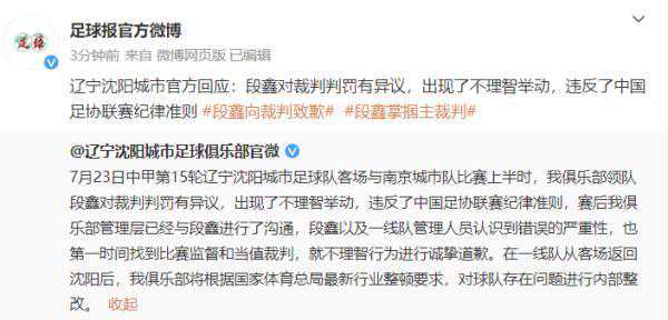 据@足球报官方微博消息,辽宁沈阳城市俱乐部23日晚通报:段鑫对裁判判罚有异议,出现了不理智举动。全文如下:
