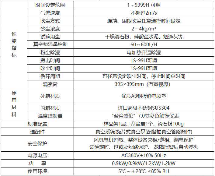 在试验工作完成之后,需要进行更换滑石粉,操作人员打开左侧的箱门以及漏斗底下的阀门,同时清理报废的滑石粉,然后将滑石粉放进设备箱内的筛网上,用手启动振动,滑石粉被振入漏斗内,然后通过风吹送入箱内。如果在试验过程中要求中间检验的话,需要在达到规定试件后,停止鼓风机,等到灰尘降落之后打开玻璃门,在不取出样品的情况下进行检测,如果该试验不需要中途检测,可以在试验结束等待灰尘完全降落之后,操作人员直接取出样品。