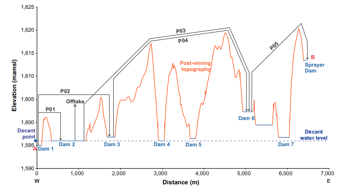 作为煤矿水管理战略的一部分,在a坑内运行了一个水再循环系统,在采矿和采矿后留下了一些空隙康复,根据矿山使用的术语,坑中的空洞被称为坝,中间还有一条纵横交错的痕迹连接了坑内的所有水坝。