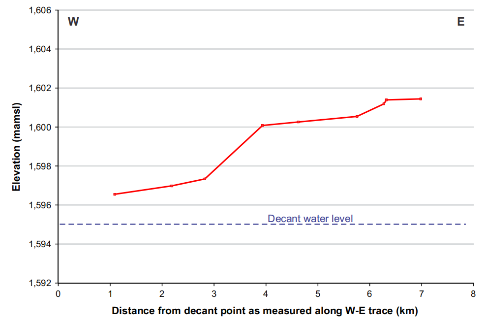 3号坝、6号坝和喷雾器坝的水位远远高于滗液水位,这些大坝都直接或间接地从1号坝接收水,喷雾器大坝的水位比滗水器水位高17米以上,这种高坝的存在表明,回填坑修复过程中使用的表土的渗透性足够低,足以使灌溉水形成池塘。