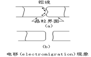 所谓电子迁移(Electromigration),乃指在电流作用下的金属。此系电子的动量传给带正电的金属离子所造成的。当组件尺寸愈缩小时,相对地电流密度则愈来愈大;当此大电流经过集成电路中的薄金属层时,某些地方的金属离子会堆积起来,而某些地方则有金属空缺情形,如此一来,堆积金属会使邻近的导体短路,而金属空缺则会引起断路。材料搬动主要原动力为晶界扩散。以溅镀法所沉积的Al,经过适当的Anneal之后,通常是以多晶(Poly-Crystalline)形式存在,当导电时,因为电场的影响,Al原子将沿着晶粒界面(Grain-Boundary)移动。