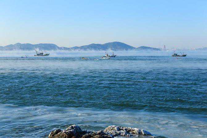 1月7日清晨,青岛近海海域像开了锅,海面上“蒸汽腾腾”,仿佛海水被煮沸了一般;船只、海岛影影绰绰,仿佛置于云层之上,如梦如幻。