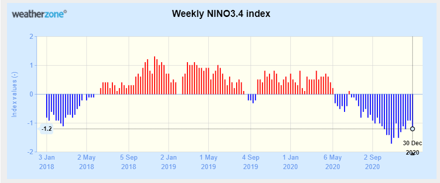图:截止到2020年1月30日表征厄尔尼诺(红色)或拉尼娜(蓝色)的指数变化