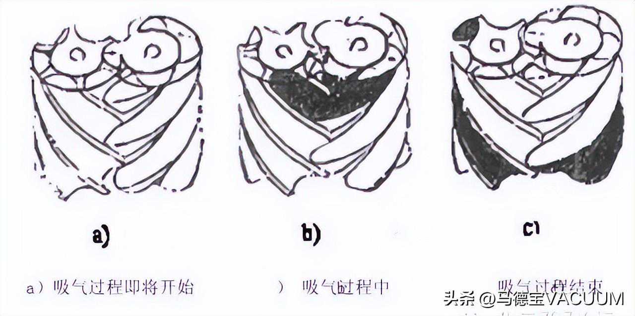 吸气过程结束时的转子位置如图c所示,其最显著的特点是齿间容积达到最大值。
