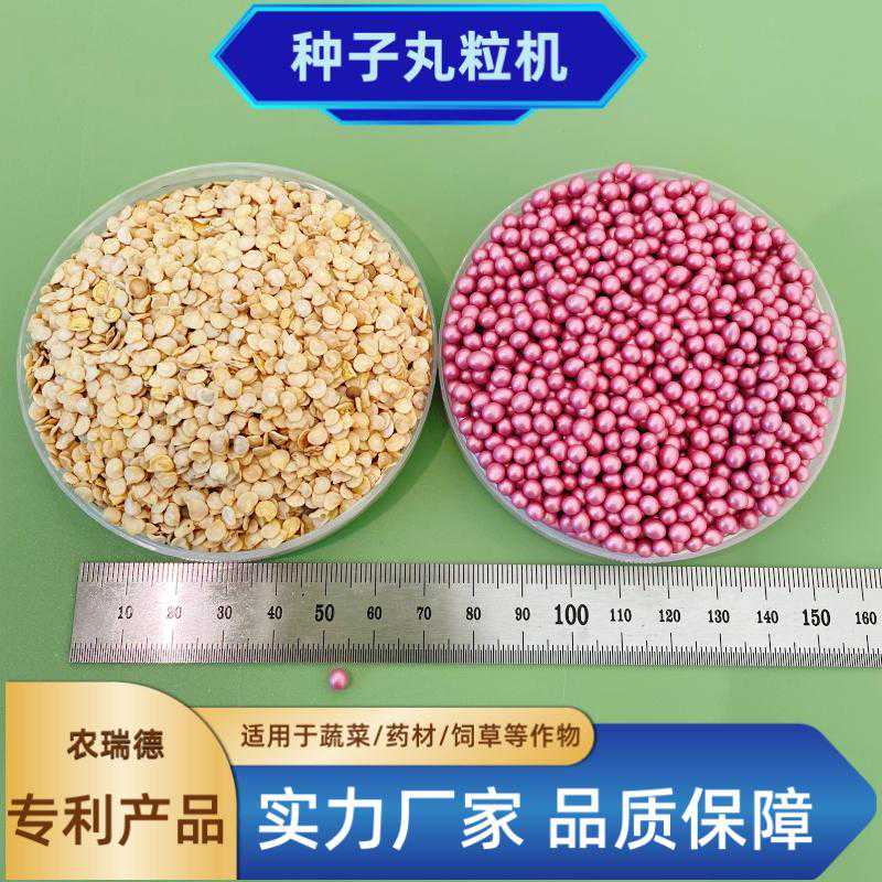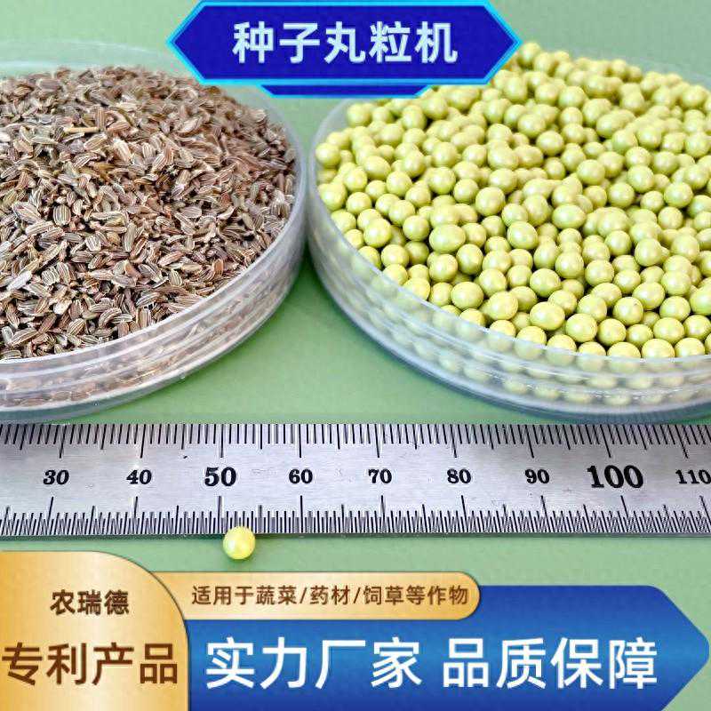 种子丸粒化是利用水和易分散的黏着剂与种子充分混匀,使每粒种子表面上涂上一层黏着剂,然后让种子在丸粒机中滚动,根据不同的目的加入相应的粉料、农药、微肥和植物生长调节剂等。随着种子的不停滚动,粉料、农药、微肥和植物生长调节剂黏附在种子表面,最后形成大小适中的种球。