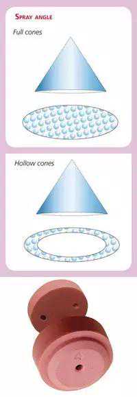 1、涡流式喷头:喷头内部有一个涡流室,被液压逼着高速奔来的药液,在涡流室内绕涡流芯旋转,产生的离心力推着它从喷孔旋转着喷出,和空气分子相撞,形成一个空心或实心的圆锥雾型。空心型锥体的中心雾滴少,边缘的雾滴多。实心型锥雾则相反。雾滴的大小和药液压力、喷孔孔径有直接关系。压力大、喷孔小,细雾雾滴多;刚喷出的雾滴大,随着一路前行和空气分子的冲撞,雾滴逐渐变小。