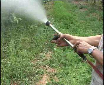 2、撞击式喷头(高压喷枪):它由喷嘴、喷帽、喷杆和扩散片等部分组成,原理是以超过1500~2500千帕的压力从喷嘴呈柱形冲出和空气对撞而形成药雾,每分钟的流量达到30升,最大射程15米左右。通过调整喷杆的伸缩,还可以控制喷幅和距离,紧缩喷杆压缩喷枪内的空间,喷出来的细小雾滴更多,喷幅加大距离减小。生产中很多果农往往不注意在喷药作业前先调试好压力、喷幅和雾化质量三者之间的平衡,以猛、快和靶标上有药液流淌而下为准,喷雾效果不理想。