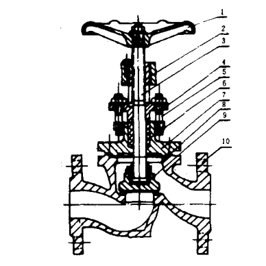 1-手轮;2-阀杆螺母;3-阀杆;4-填料压盖;5-T型螺栓;6-填料;7-阀盖;8-垫片;9-阀瓣膜;10-阀体
