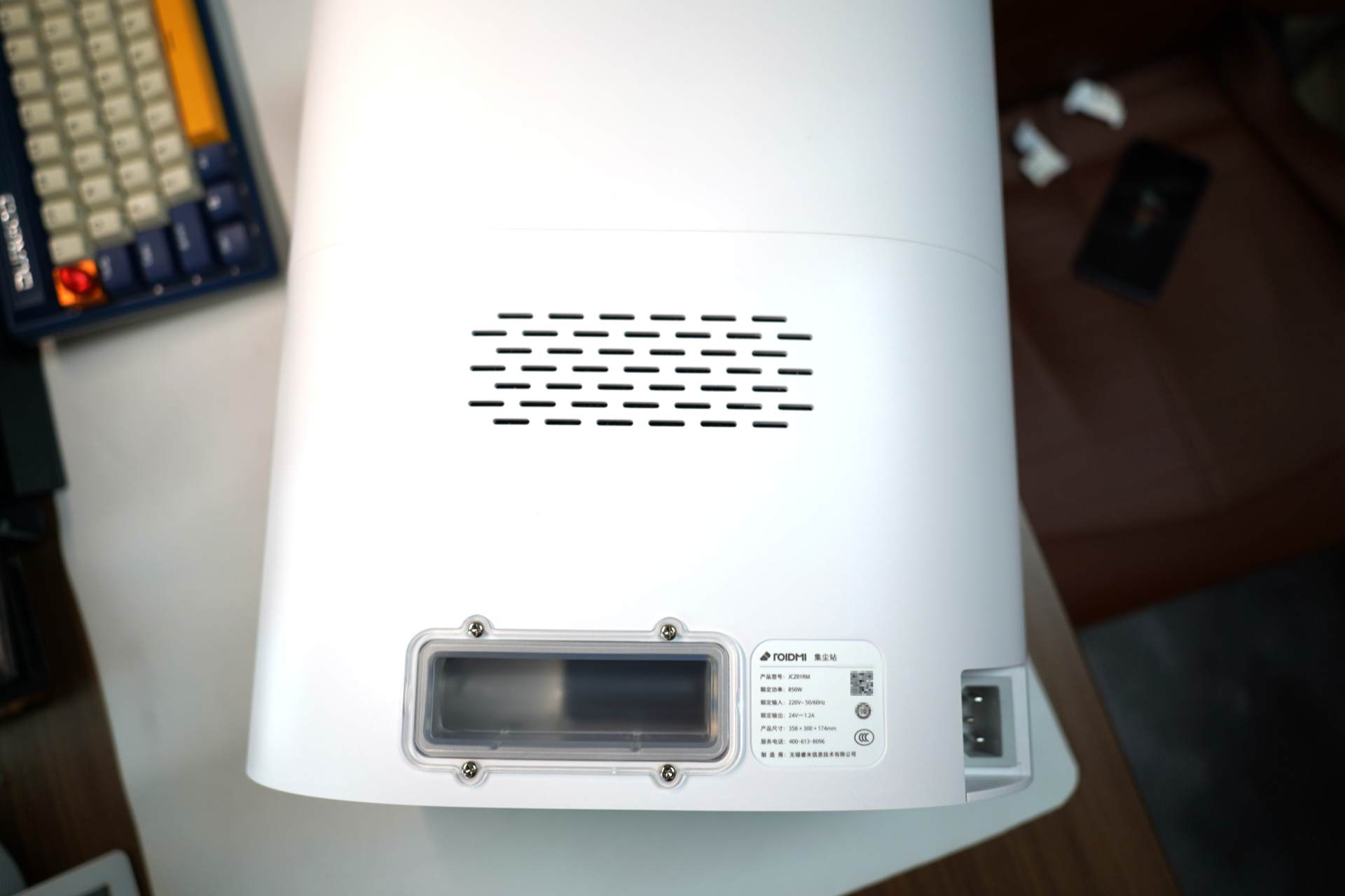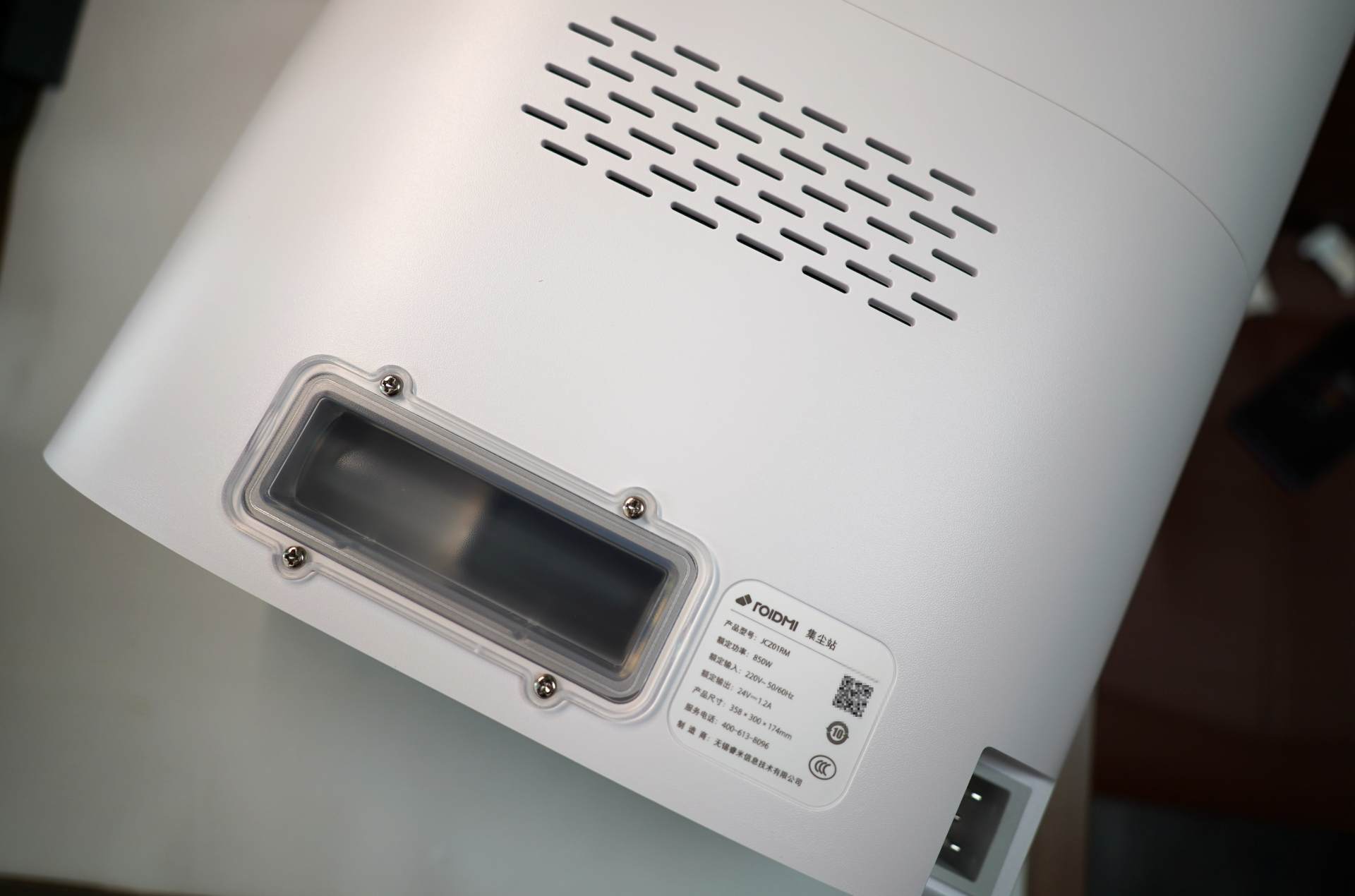 ▲睿米扫拖机器人EVEPlus的集尘站功率为850W,算是非常大的使用功率,不过集尘站只在扫地机器人回充的才会工作,一次工作大概10多秒时间,通过强大的负压吸力将粉尘吸入尘袋收纳。