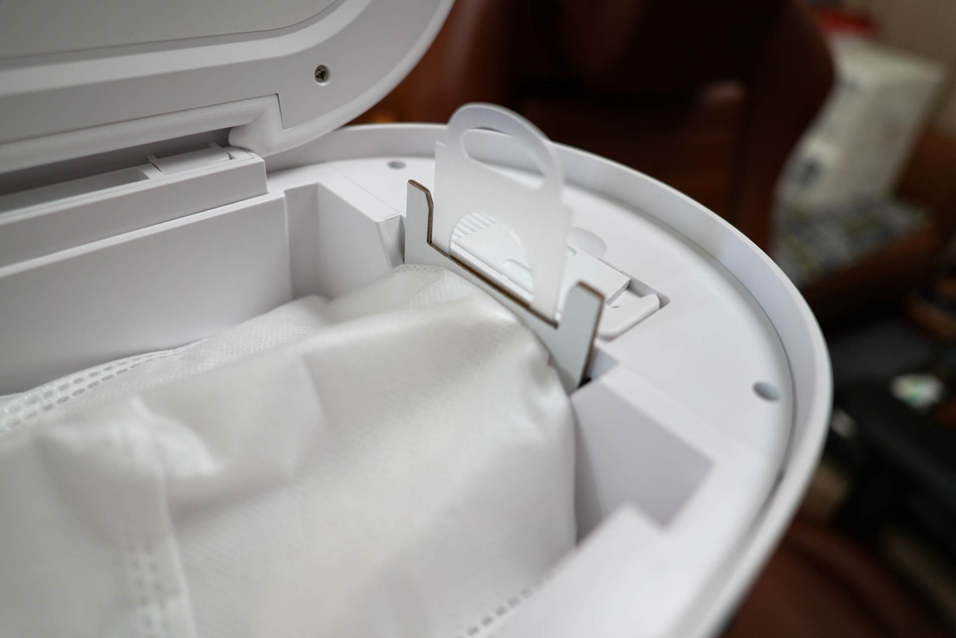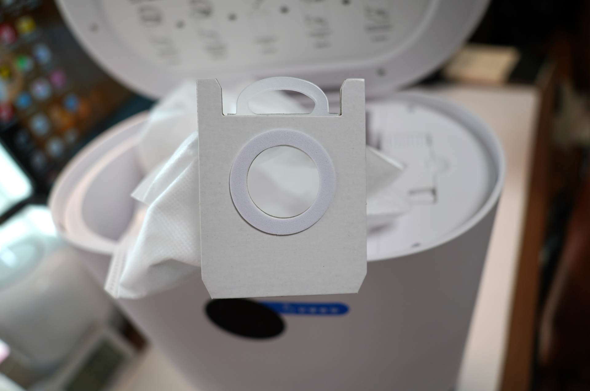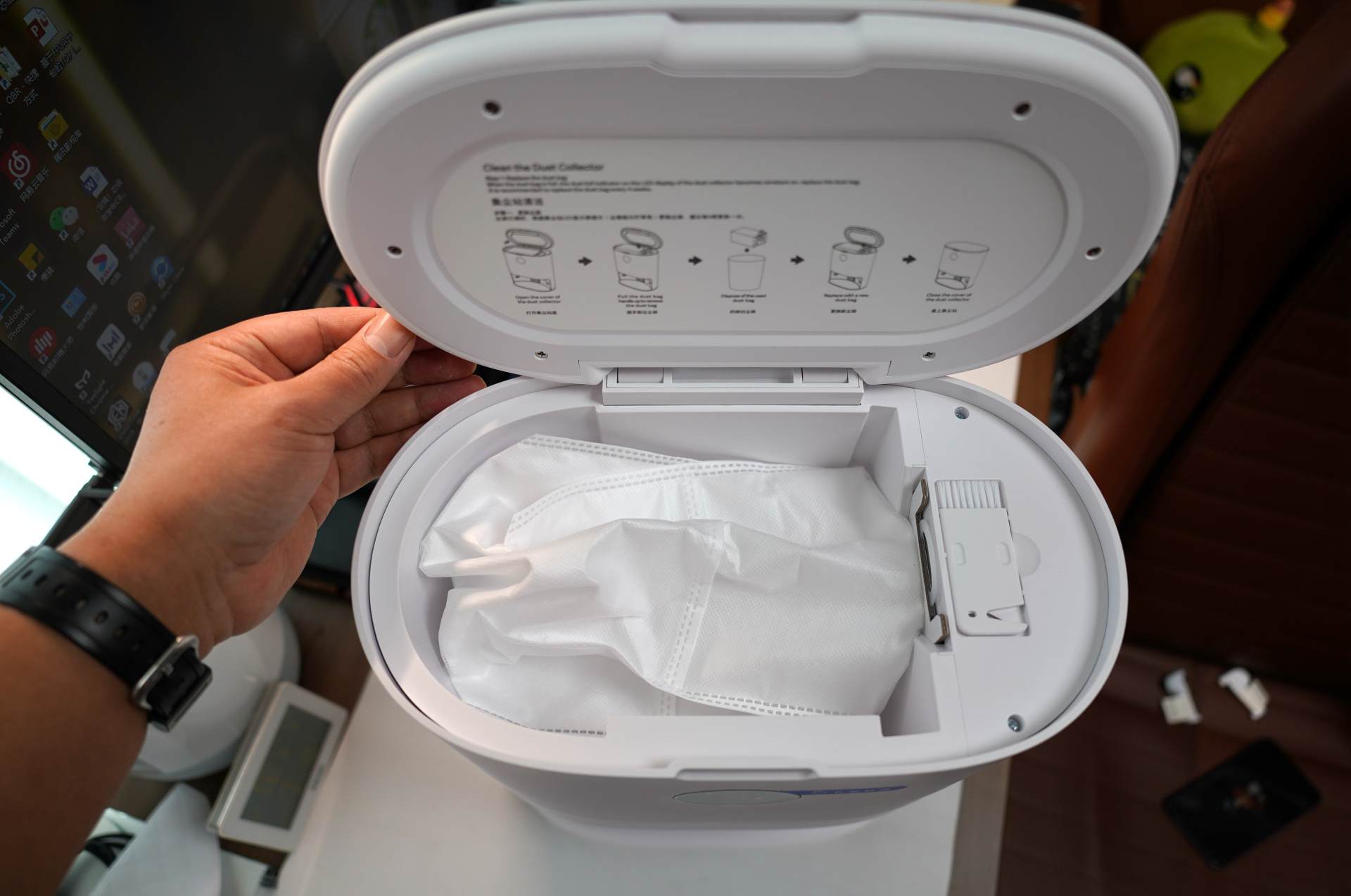 ▲尘袋的取下和安装都非常的的方便,除了内置一个尘袋之外,包装内还额外附送了四个尘袋,基本5个月都不用购买尘袋了。