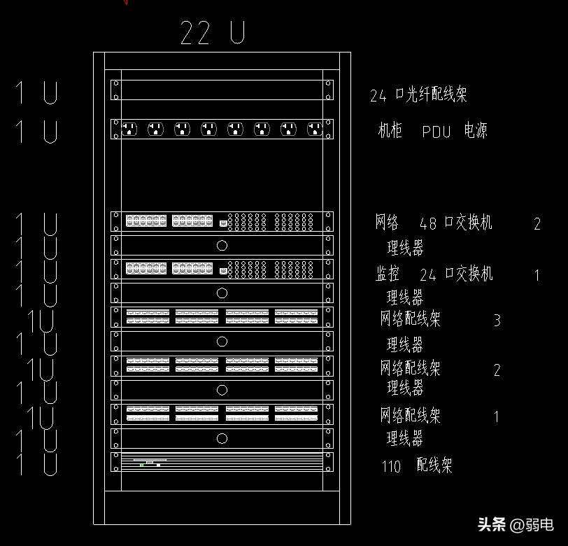 这里面我们列举下,22U、27U、42U、47U机柜的布局CAD图详解。