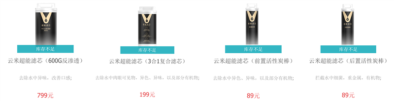 滤芯的更换价格不等,除了“粗又大”的RO滤芯高达799元(400G版本为599元),其他的都在一两百左右。