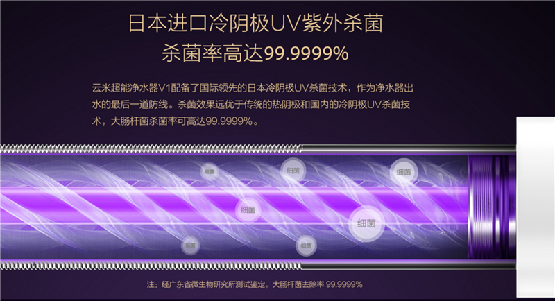 UV紫外线杀菌是之前1999元小米厨下式净水器没有的,这个紫外线灯是对进入到水管内的水进行最后一次杀菌,防止由水管老化带来的细菌。这个灯管是隐藏在厨下的,使用寿命达60000小时,可以做到终生免更换。