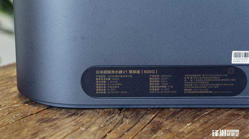 背面是云米超能净水器V1尊享版的铭牌,600G指的是每小时产净水量600加仑,官方标识的净水流量为1.4L/min,这样的出水量可以实现“即滤即喝”,且不用配备庞大的储水瓶,方便卫生,减少占地空间。