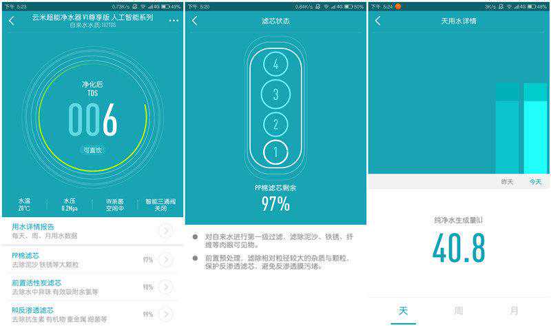 整个软件界面比较简单,基本没有需要手动设置的选项,主要功能是帮助用户监控净水器的信息,比如当前水质情况(TDS值),水温,水压,滤芯寿命,而在滤芯到期后支持一键下单更换。