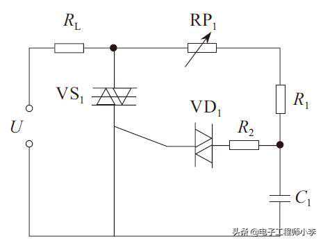 电路中RP1、R1、R2、C1和VD1构成VS1的触发电路。正弦交流电的正半个周期电压通过RL、RP1和R1对C1进行充电,当C1上的充电电压上升到一定程度时,C1上的电压通过R2加到双向触发二极管VD1上,使得VD1导通,导通的VD1再将触电电压加到VS1门极,触发VS1导通。VS1导通后构成负载RL的电流回路,RL正常工作。