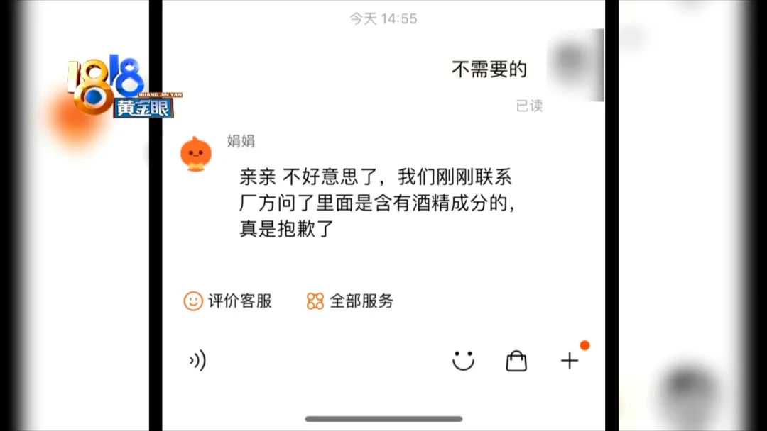 瓶身上没有生产日期。小刘后来给记者发了两张截图,说顶威医疗器械专营店的客服回复,联系厂家后确认产品里面含有酒精成分,但无法提供厂家的联系方式。记者联系了店家负责人,对方表示,产品是2021年在秦石药业生产的,产品手续都是合法合规的。
