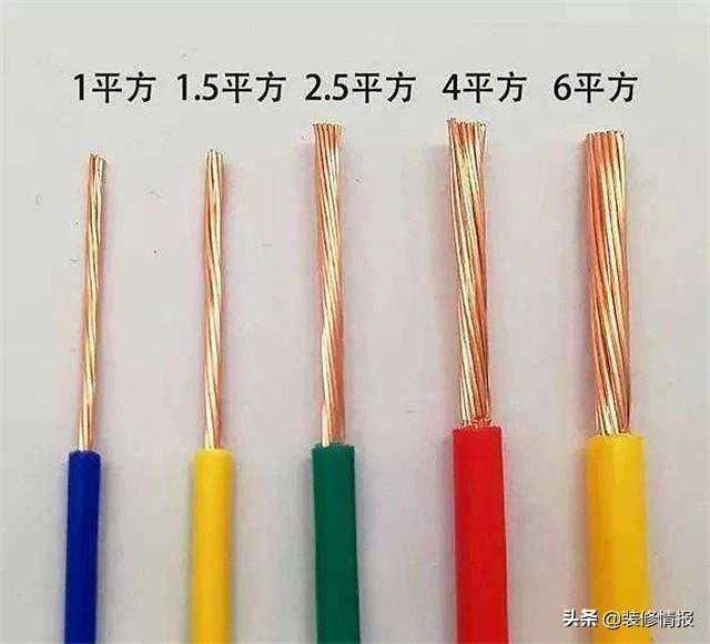 现在家用铜线规格多为1、1.5、2.5、4、6平(1平指国标电线的横截面积为1平方毫米)。红色用做火线,蓝色用做零线,黄绿双色为地线,以最大安全电流来算,列表如下: