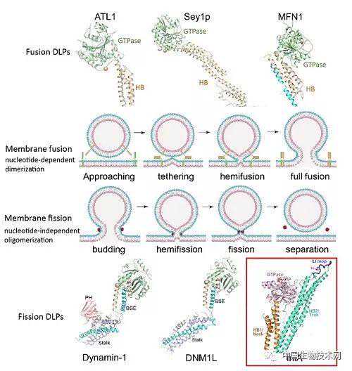 图示:膜融合与魔分裂的反应模式图。代表性的融合发动蛋白和分裂发动蛋白的晶体结构,其中该研究解析的IniA结构由红框显示。