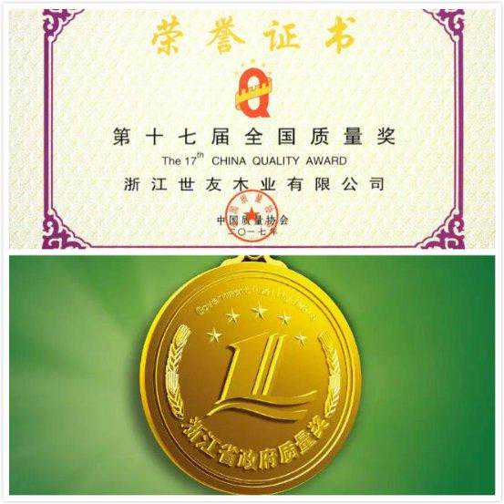 2017年,世友地板第二次获得“全国质量奖”;2013年世友地板获得浙江省政府质量奖,是浙江省首个斩获该个奖项的地板企业;2018年,世友地板第一批通过国家“绿色产品认证”;同年五月,世友地板被评为“国家级绿色工厂”。