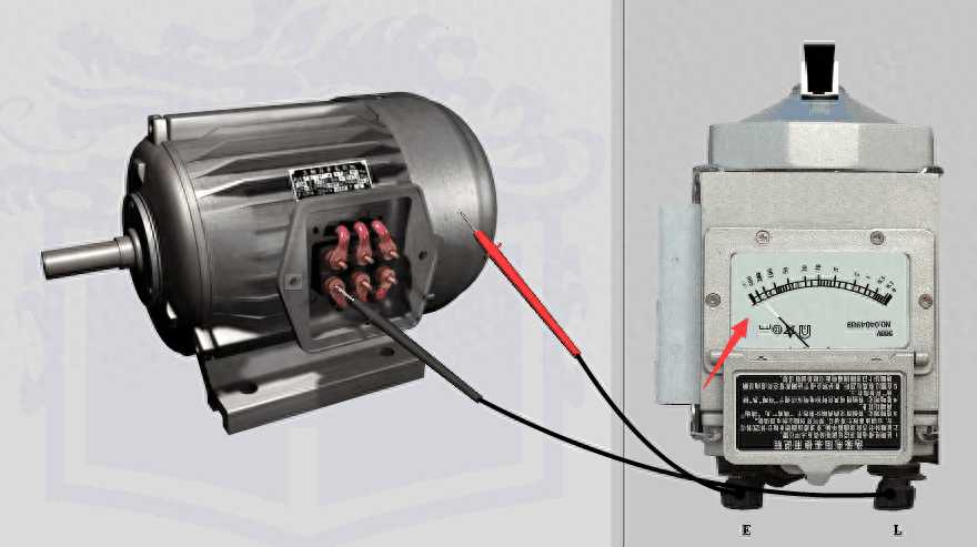 第一步:测三相输出端与外壳的绝缘电阻,E接触电机外壳,L分别接触UVW三个接线端,以每分钟120转左右的速度摇动手柄,待指针稳定在无穷大附近时即为绝缘良好