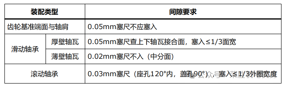 ①齿轮装配时,齿轮基准面端面与轴肩或定位套端面应靠紧贴合,且用0.05mm塞尺检查不应塞入;基准端面与轴线的垂直度应符合传动要求。
